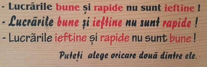 Dacă cineva îți promite un site profesional „în două zile și la doar 200 de lei”, fugi! Știi vorba aia? O lucrare poate să aibă doar 2 din cele trei: „rapid, bun, ieftin”. Dacă vrei rapid și ieftin 100% n-o să fie bun :( O lucrare de calitate necesită timp și experiență.
