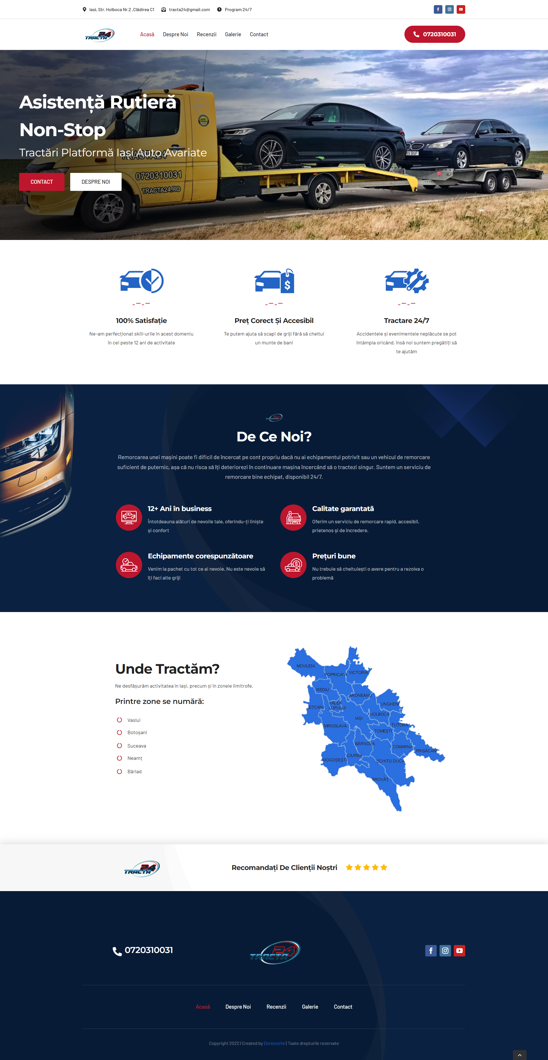 Platforma este specializată în servicii de tractare auto și asistență rutieră în zona Iași. Website-ul este optimizat pentru a facilita accesul rapid la informații despre servicii, cu un design simplu și intuitiv. Utilizatorii pot solicita ajutor rutier printr-un sistem ușor de utilizat, disponibil 24/7.