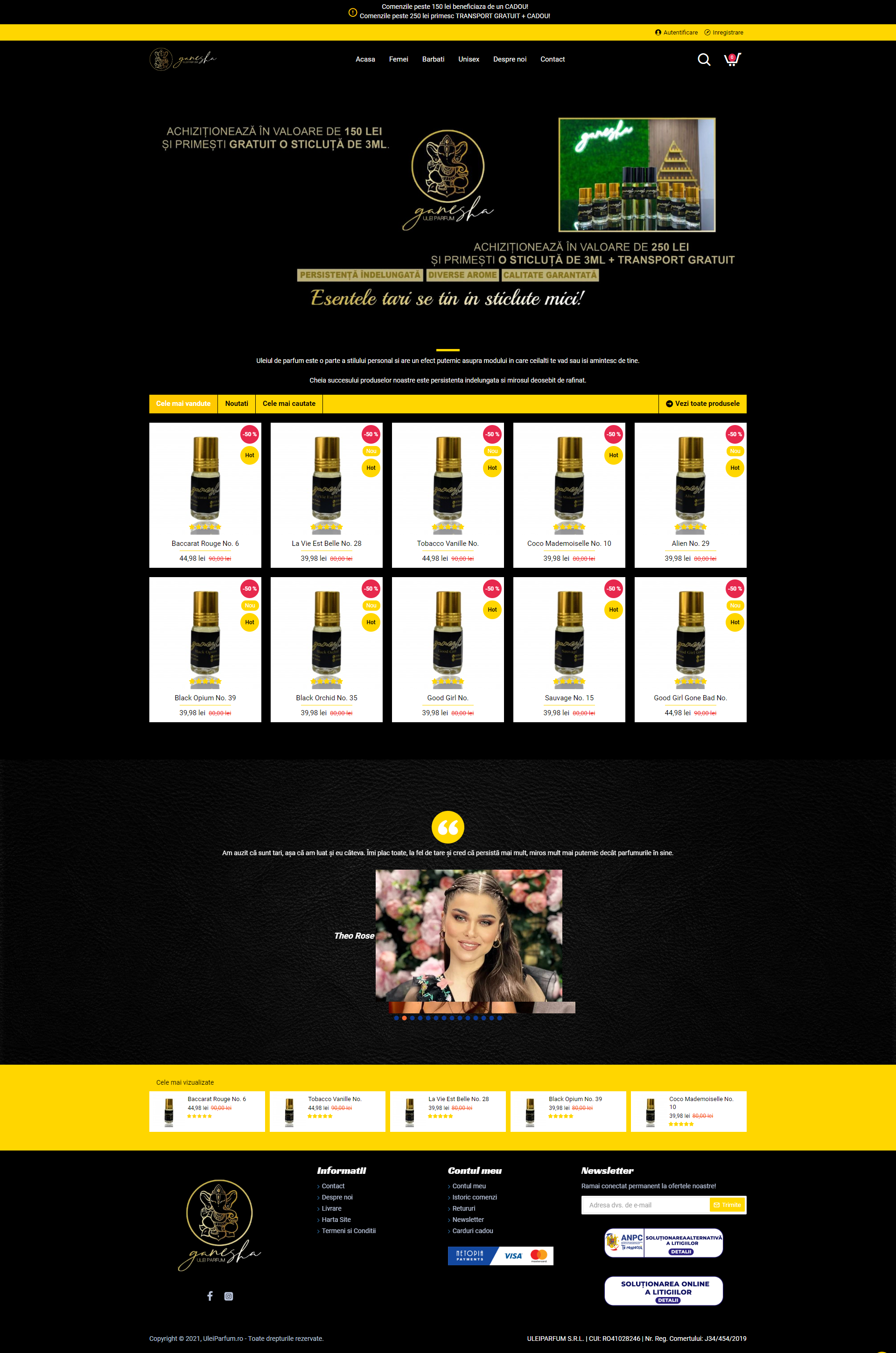 Această platformă oferă o colecție variată de uleiuri parfumate, concepute pentru cei care preferă esențe concentrate și de lungă durată. Fiecare produs este prezentat cu detalii clare și sugestii pentru utilizare, punând accent pe beneficiile și specificul fiecărei arome. Magazinul online este intuitiv, cu opțiuni de filtrare pentru a găsi rapid uleiurile parfumate preferate. Designul modern și elegant creează o experiență de cumpărare plăcută, completată de servicii rapide de livrare și asistență pentru clienți.